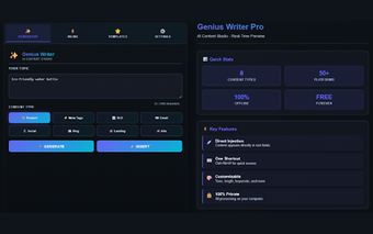 Genius Writer Pro är en gratis webbläsartillägg för Chrome som fungerar som en AI-driven skrivassistent. Den låter användare generera professionellt innehåll och injicera det direkt i textfält på olika webbplatser. Med funktionen för direktinjektion kan du enkelt skapa produktbeskrivningar, e-postmeddelanden, inlägg på sociala medier och blogginlägg på bara några sekunder. En praktisk tangentbordsgenväg (Ctrl+Alt+W) underlättar användningen och gör det möjligt att snabbt få tillgång till verktyget.